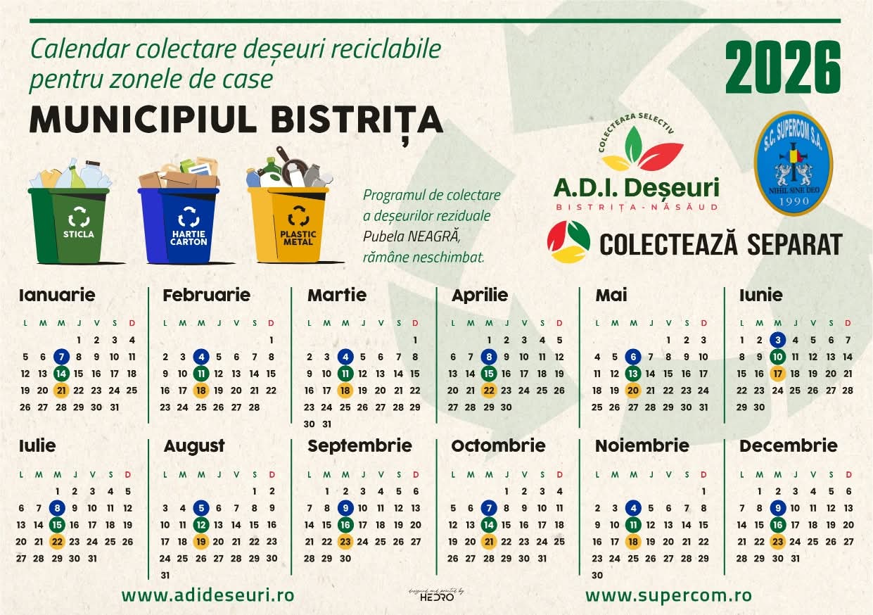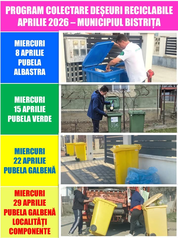 În luna APRILIE 2026, programul de colectare a deșeurilor reciclabile în Municipiul Bistrița și în localitățile componente – Unirea, Viișoara, Sărata, Sigmir, Ghinda și Slătinița, începe de săptămâna viitoare – de MEIRCURI, 8 APRILIE! Implică-te în colectarea selectivă a deșeurilor reciclabile încă din gospodăria ta!