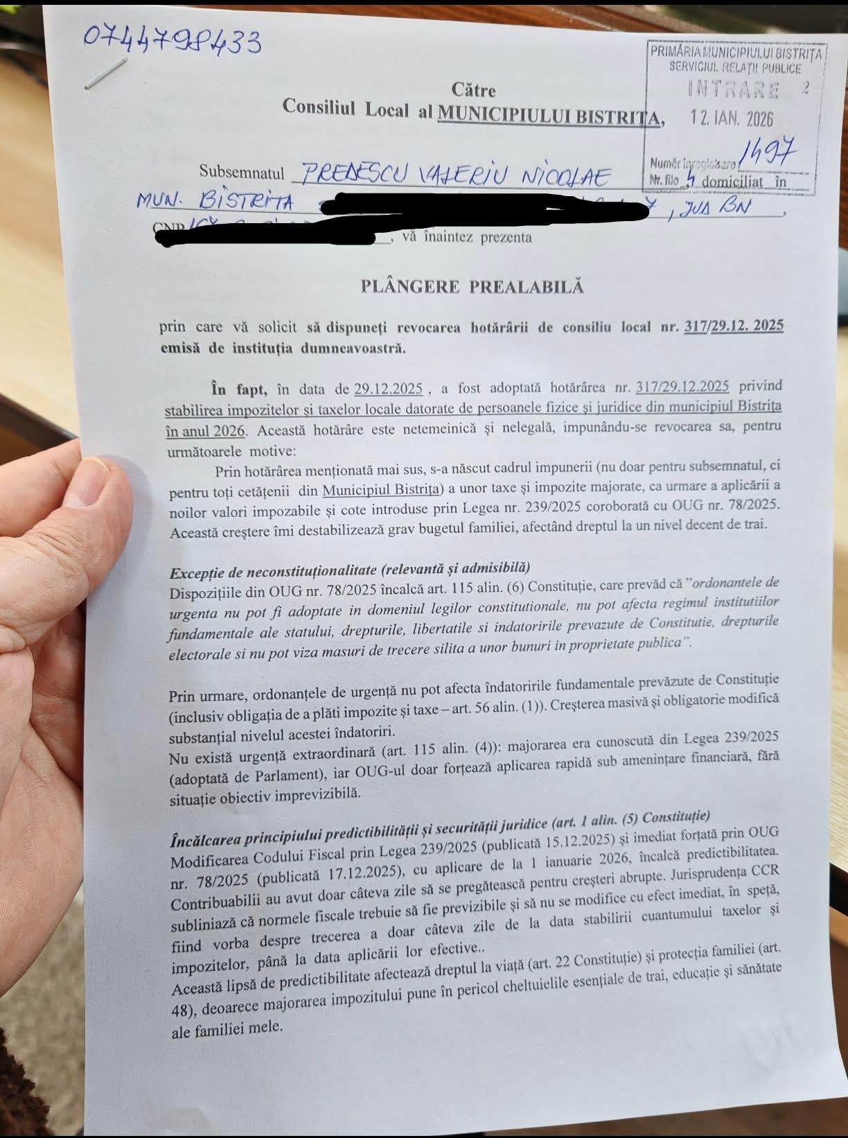 „Astăzi, împreună cu colegii mei din AUR, am făcut un pas ferm în apărarea bistrițenilor. Am depus o Plângere Prealabilă împotriva Hotărârii Consiliului Local nr. 317 din 29.12.2025, prin care au fost stabilite impozitele și taxele locale pentru persoanele fizice și juridice din Municipiul Bistrița.