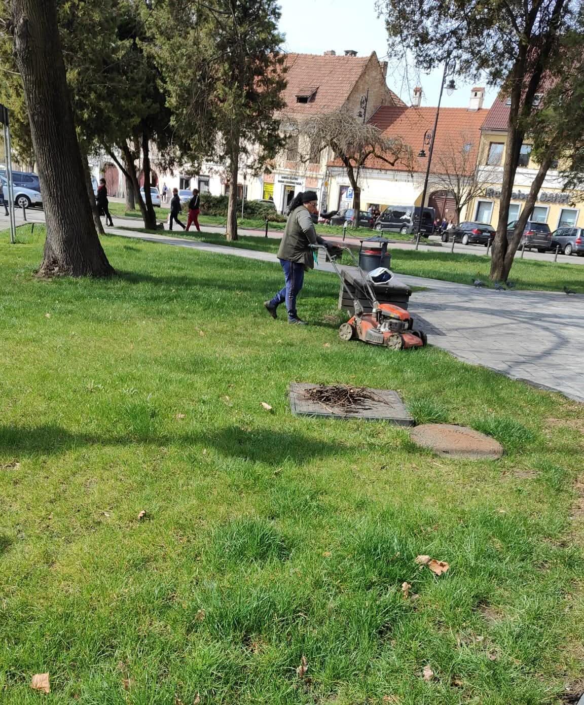 În paralel, s-au efectuat lucrări de cosire a gazonului în zona Parcului Piața Unirii – Protopopiatul Ortodox – și pe bulevardul Republicii. De asemenea, în baza de producție au fost confecționați tutori necesari susținerii arborilor recent plantați.