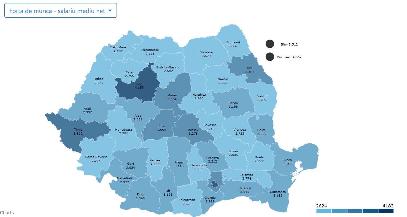 La polul opus, topul celor cinci județe cu cele mai mari salarii medii nete este dominat de București, cu 4.562 de lei, Cluj cu 4.183 lei, Timiș cu 3.802 lei, Sibiu cu 3.550 lei și Ilfov cu 3.512 lei.