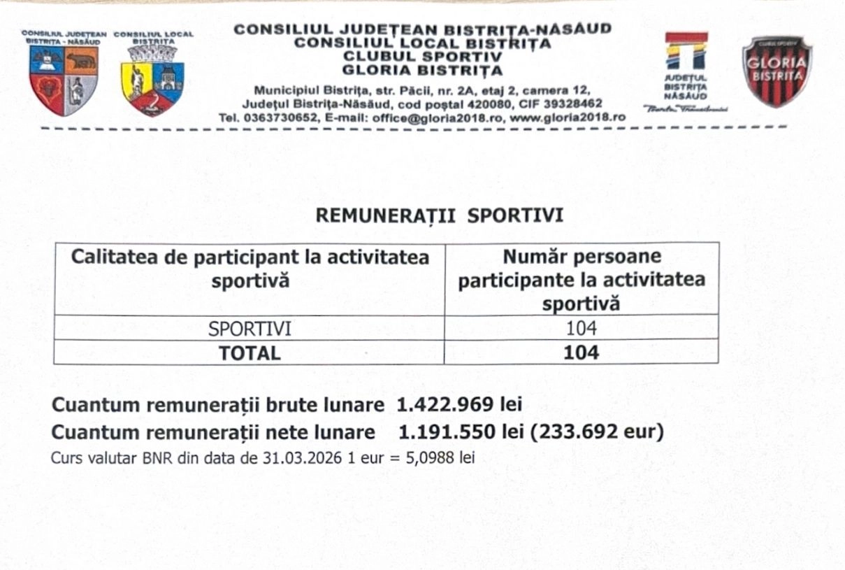 Bugetul salarial al Gloriei Bistrița: peste 100 de sportivi și zeci de angajați