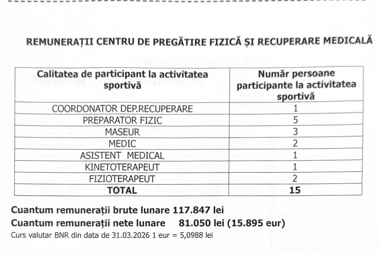 De asemenea, în cadrul Centrului de Pregătire Fizică și recuperare medicală lucrează 15 specialiști, inclusiv medici și kinetoterapeuți, pentru care se alocă lunar circa 15.000 de euro net.
