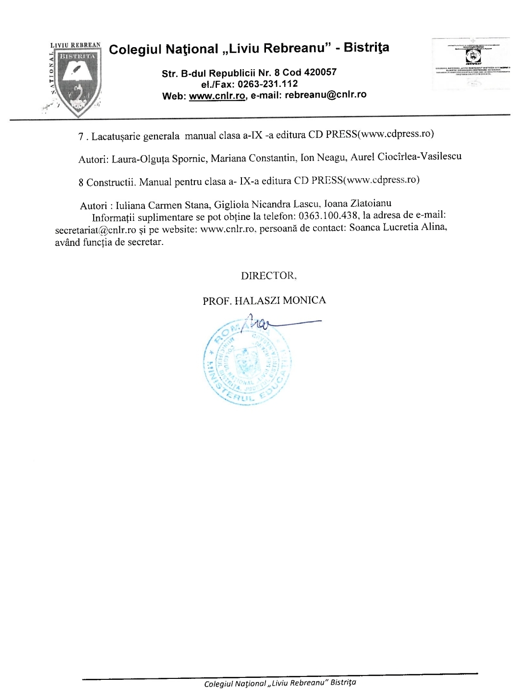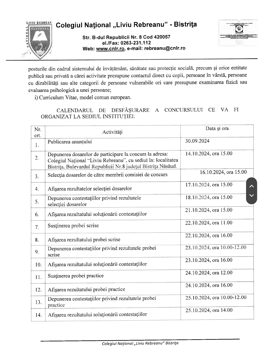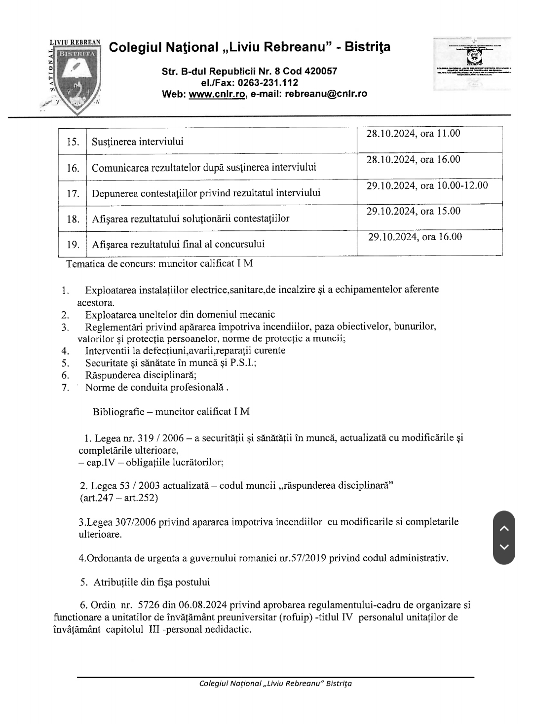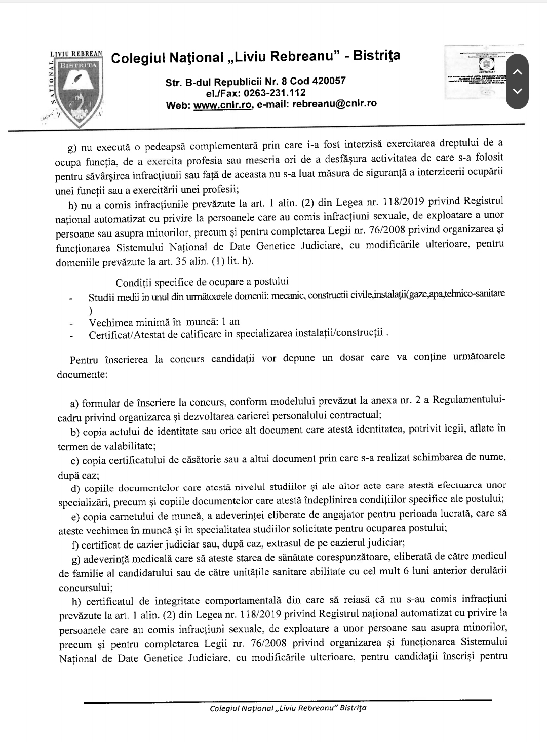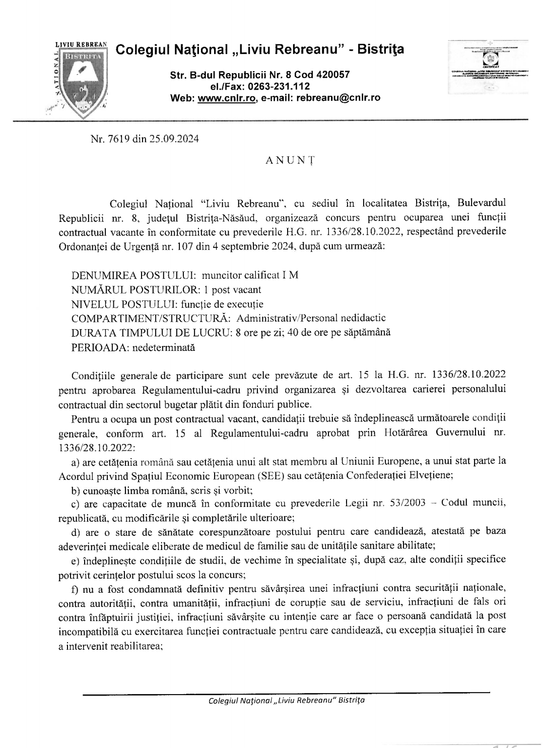 Colegiul Național „Liviu Rebreanu” Bistrița: Anunț de recrutare prin concurs pentru ocuparea postului de Muncitor Calificat Necategorisite stiriBN 4 octombrie 2024
