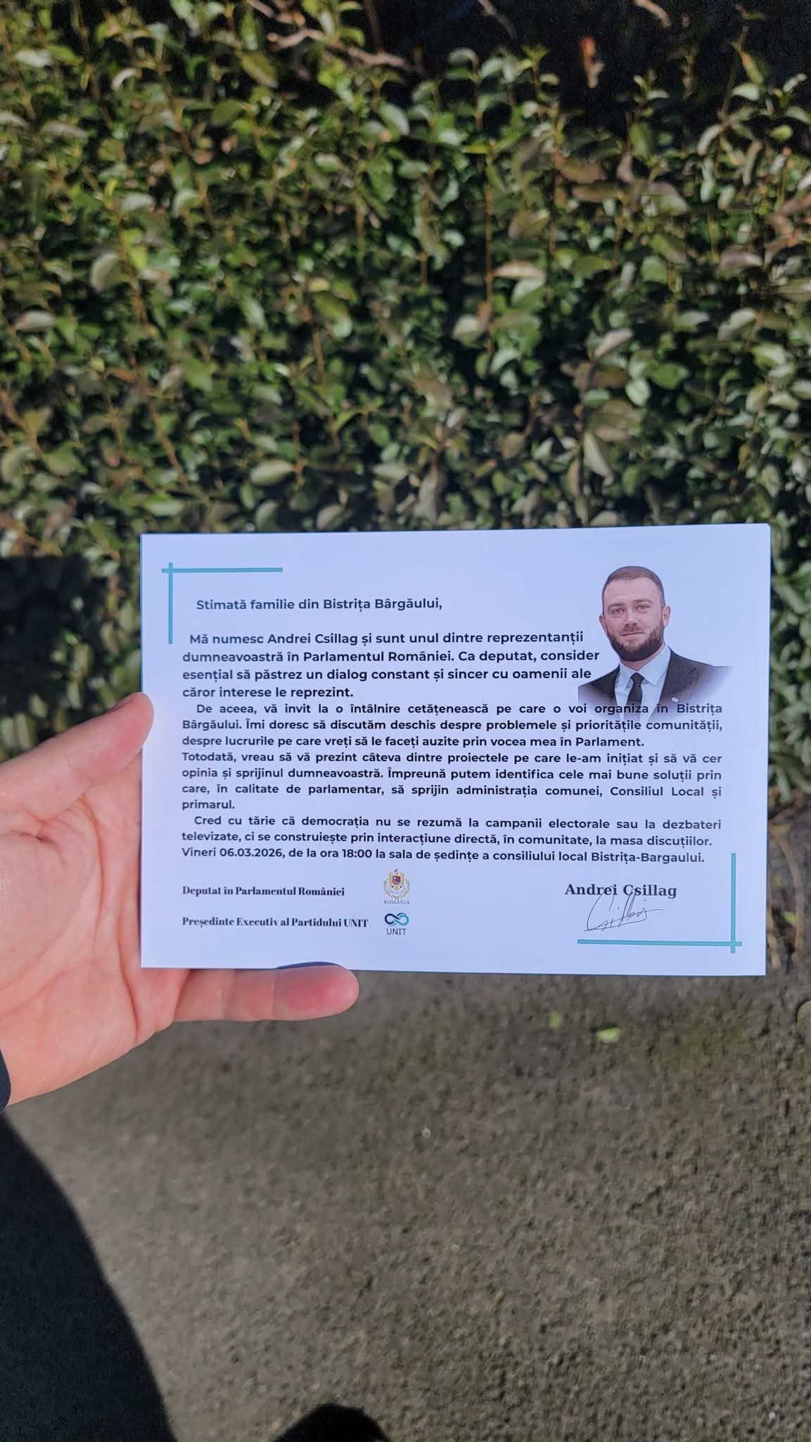 Vineri 06.03.2026, de la ora 18:00 la sala de ședințe a consiliului local Bistrița-Bargaului.”, a transmis pe pagina sa de socializare, deputatul UNIT Bistrița-Năsăud, Andrei Csillag.