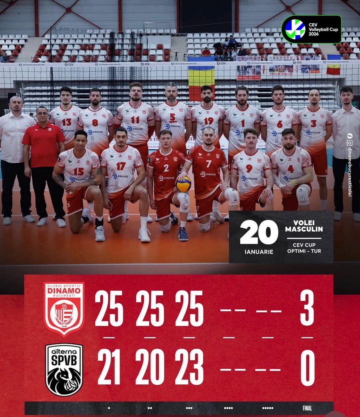 Campioana României la volei masculin, Dinamo București, a făcut un pas important spre sferturile CEV Cup, după victoria categorică, scor 3-0, obținută în fața formației franceze Alterna SPVB Poitiers, în manșa tur a optimilor de finală.