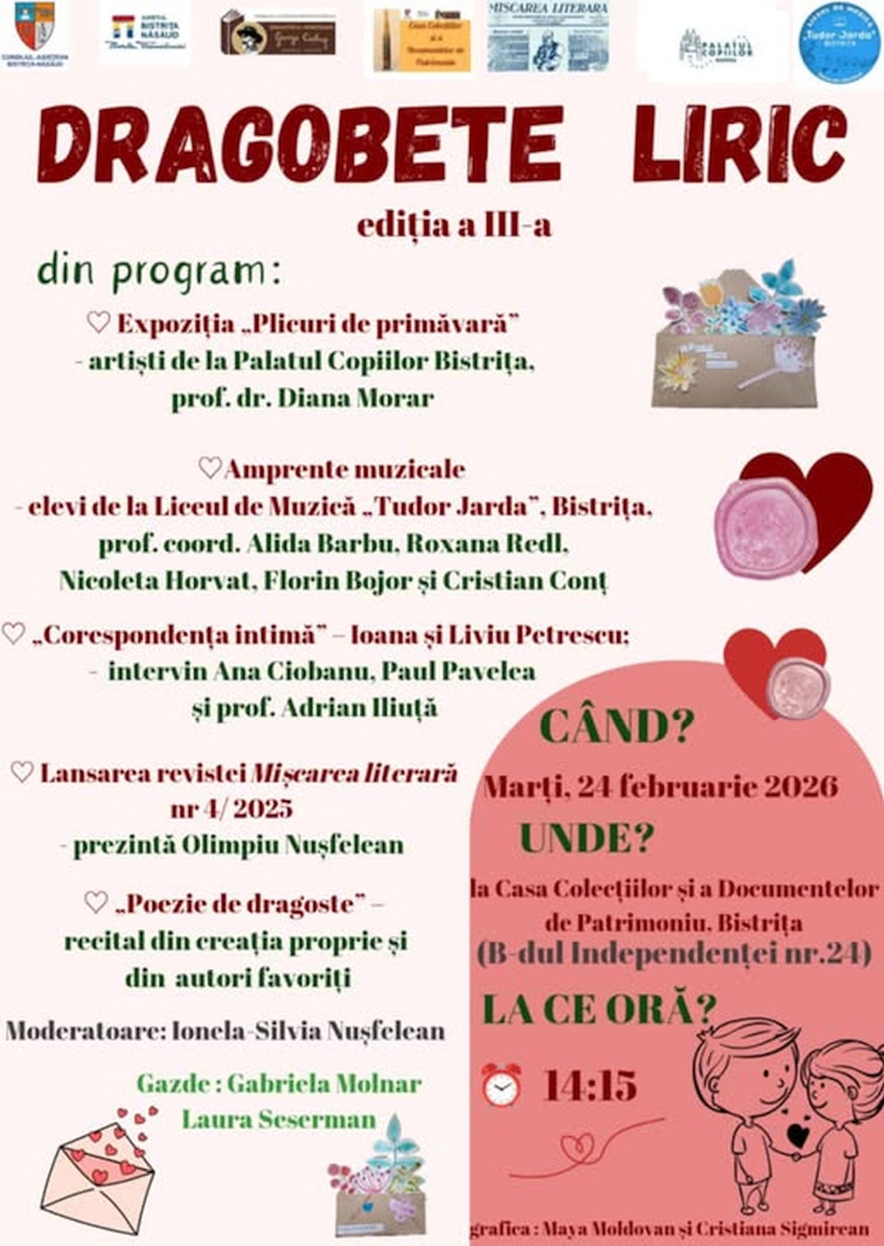 De Dragobete, iubirea prinde glas la Casa Colecțiilor și a Documentelor de Patrimoniu, unde are loc cea de-a treia ediție a evenimentului „Dragobete liric”. Manifestarea este organizată de Consiliul Județean Bistrița-Năsăud, alături de Biblioteca Județeană „George Coșbuc” Bistrița-Năsăud, Revista „Mișcarea Literară”, Palatul Copiilor Bistrița și Liceul de Muzică „Tudor Jarda” Bistrița.