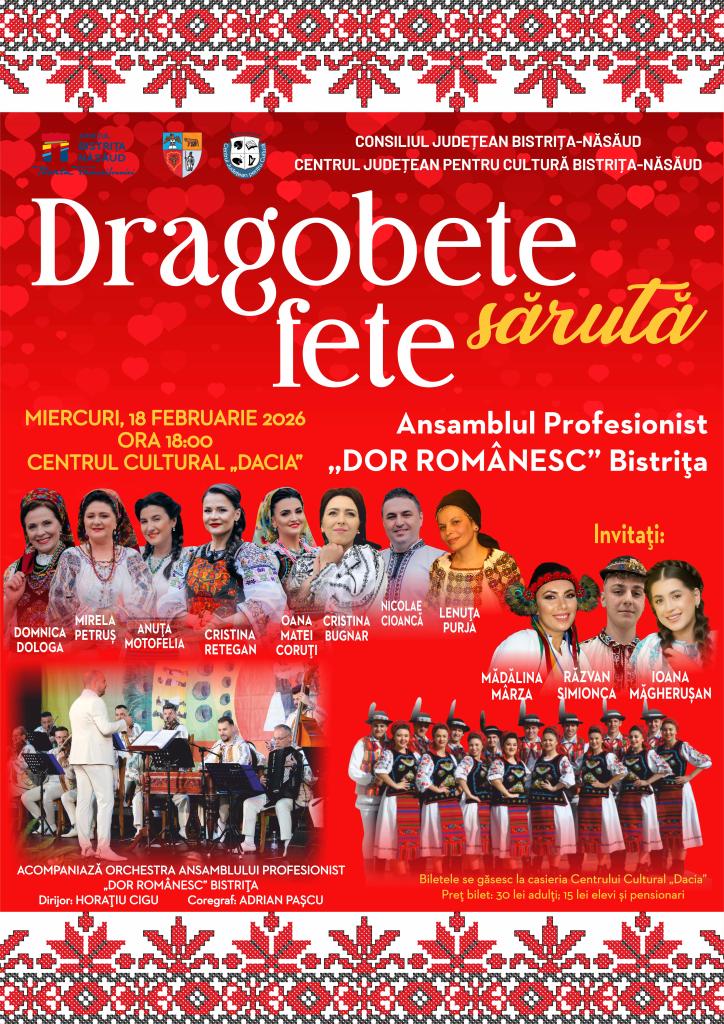 Dragobetele este sărbătorit românește la Bistrița printr-un spectacol de suflet susținut de artiștii Ansamblului Profesionist „Dor Românesc” și invitații lor. Evenimentul „Dragobete sărută fete” va avea loc miercuri, 18 februarie 2026, de la ora 18:00, la Centrul Cultural „Dacia”.