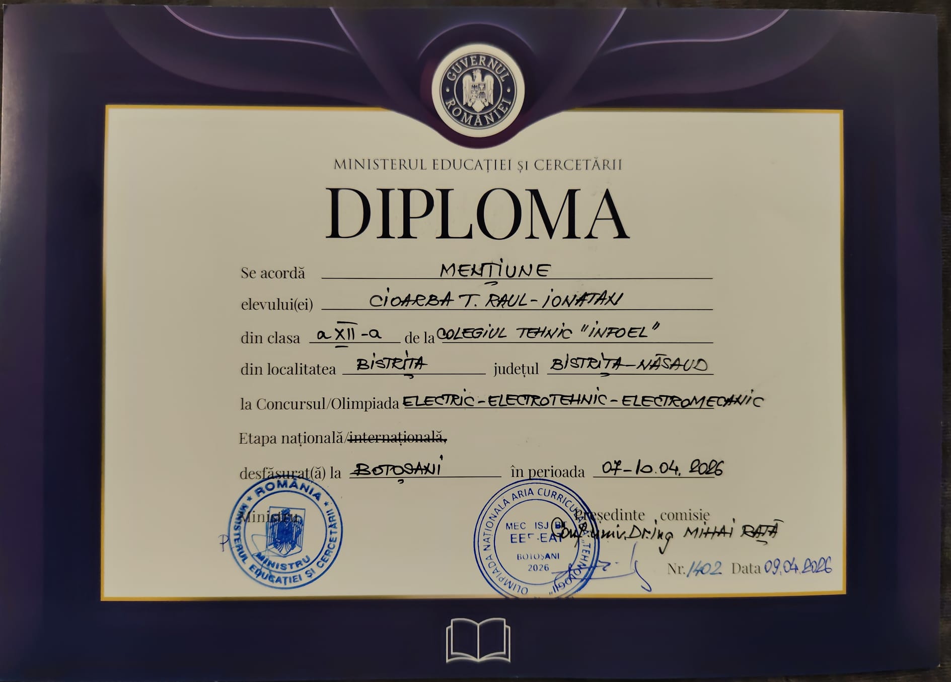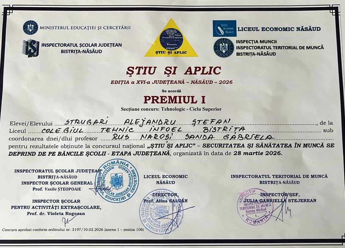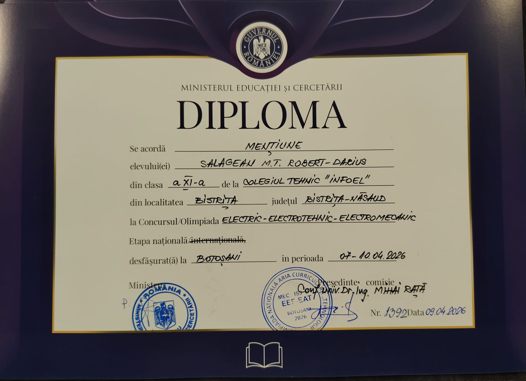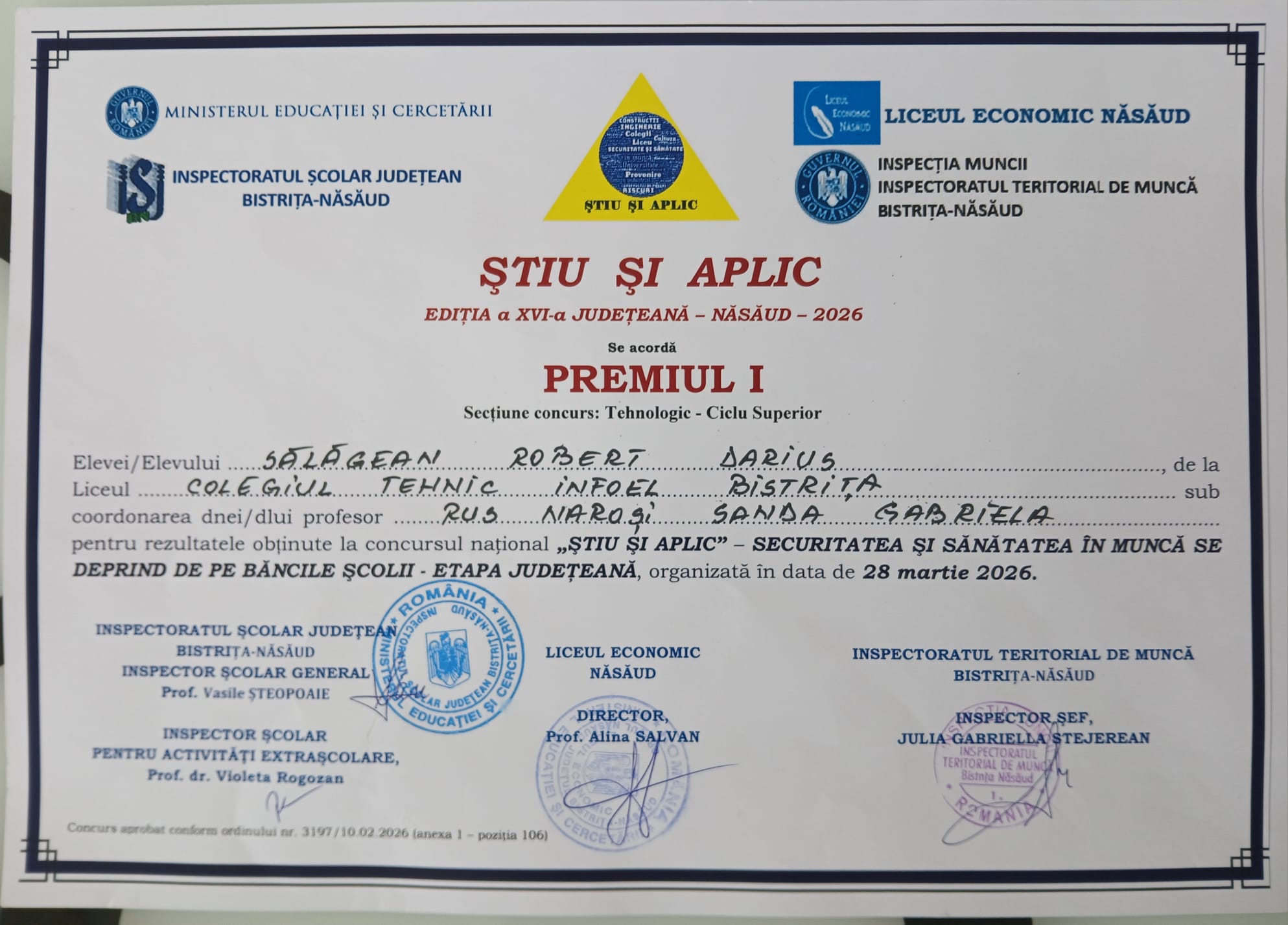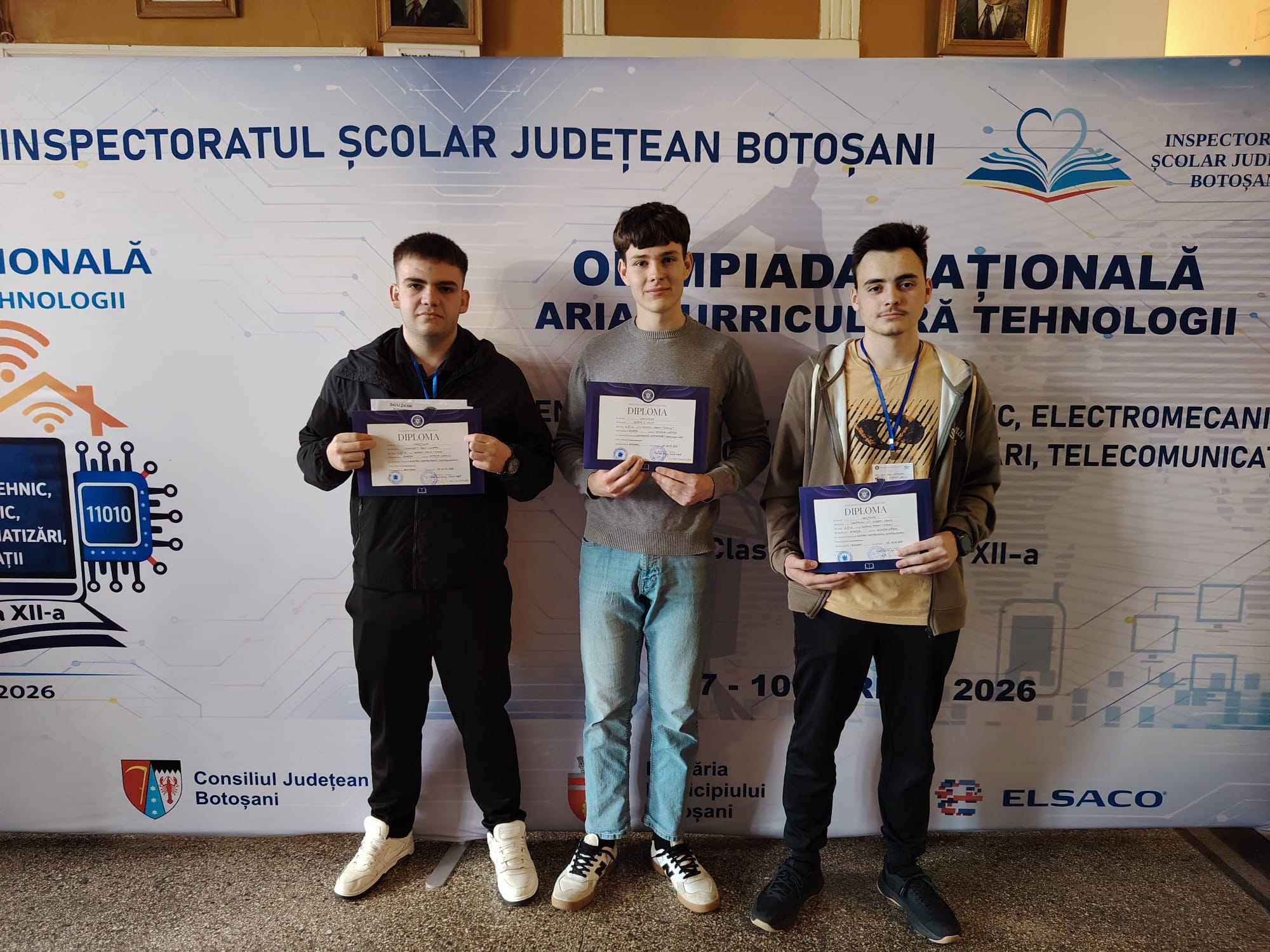 La Olimpiada Județeană Aria Curriculară Tehnologii – Domeniul Electric, Electrotehnic și Electromecanic, elevii pregătiți de profesorii Sanda Gabriela RusNaroși și Constantin Rusu au fost pe pe podium. Robert Darius Sălăgean din clasa a XIa și Raul Ionatan Ciorba din clasa a XIIa au obținut Locul I, iar Alejandro Ștefan Strugari din clasa a XIa s-a clasat pe Locul II. Toți trei s-au calificat la etapa națională, desfășurată la Botoșani înaintea sărbătorilor pascale, unde au confirmat încă o dată nivelul ridicat de pregătire tehnică și implicare.