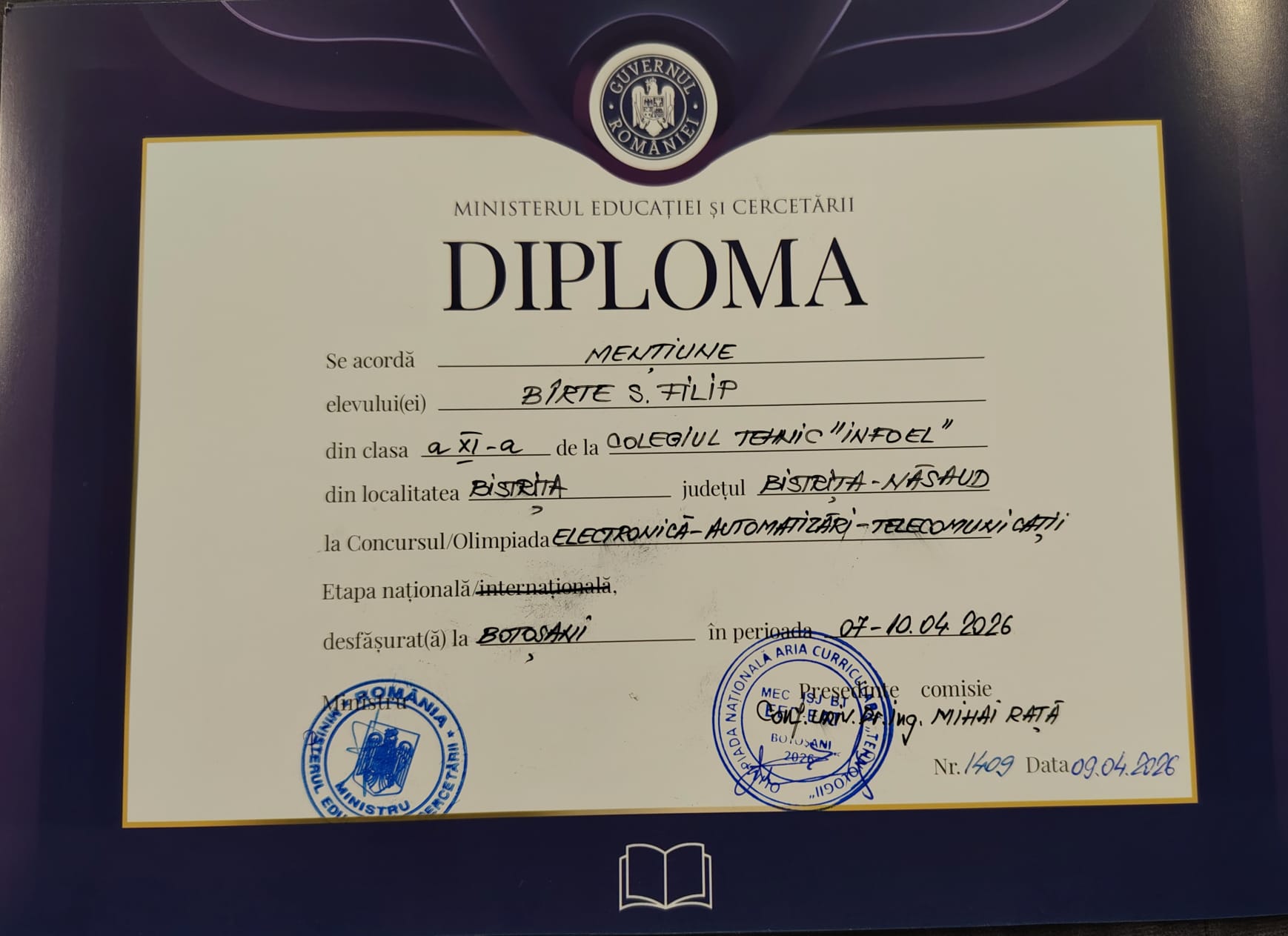 Un alt rezultat demn de laudă pentru școala bistrițeană a fost obținut și în domeniul Electronică, Automatizări și Telecomunicații. Încă un elev eminent al colegiului, Filip Bîrte din clasa a XIa, s-a remarcat la Olimpiada Națională Aria Curriculară Tehnologii- Domeniul Electronică, Automatizări și Telecomunicații. După ce a obținut Premiul I la etapa județeană, acesta a reprezentat cu succes Colegiul Tehnic INFOEL și la etapa națională. Elevul a fost pregătit de profesorii: Livia Vultur, Rodica Nicoară, Constantin Rusu și Alin Baci.