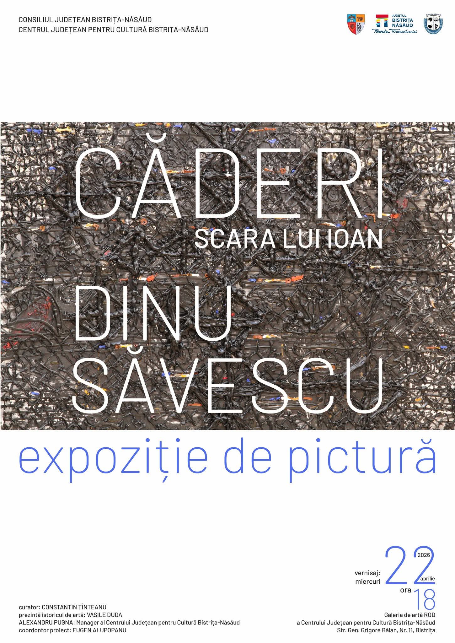 Consiliul Județean Bistrița-Năsăud și Centrul Județean pentru Cultură Bistrița-Năsăud anunță cu bucurie vernisajul unei noi expoziții de excepție la Galeria de artă Contemporană ROD. Pe data de 22 aprilie 2026, începând cu ora 18:00, publicul bistrițean este invitat să descopere universul plastic al artistului Dinu Săvescu, în cadrul expoziției de pictură intitulată „Căderi – Scara lui Ioan”.