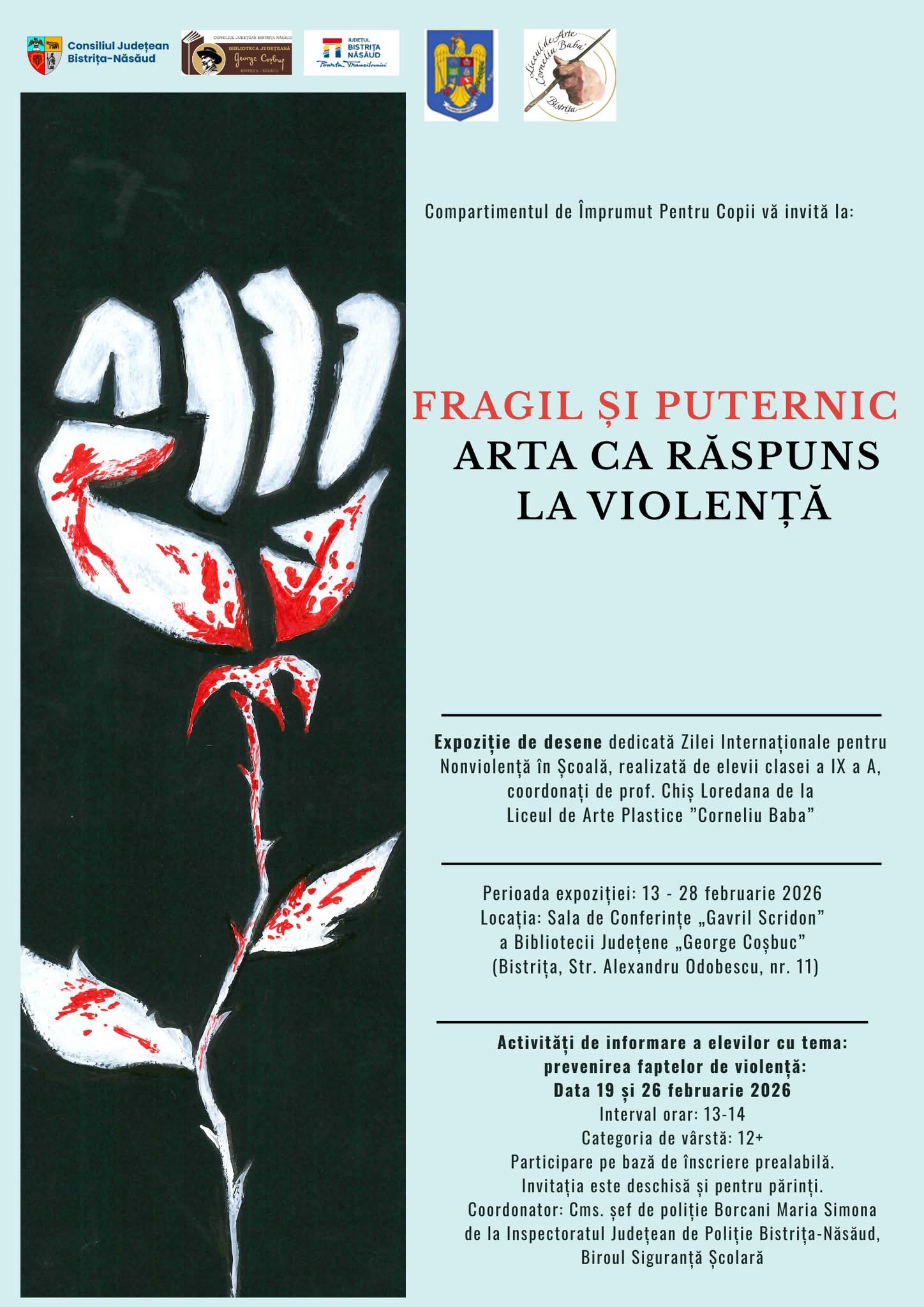 Într-un parteneriat solid între Consiliul Județean Bistrița-Năsăud, Inspectoratul de Poliție Județean Bistrița-Năsăud, Liceul de Arte „Corneliu Baba” Bistrița și Biblioteca Județeană „George Coșbuc” Bistrița-Năsăud, Compartimentul „Împrumut pentru Copii” invită publicul la un eveniment cu un mesaj profund și necesar: „FRAGIL ȘI PUTERNIC. ARTA CA RĂSPUNS LA VIOLENȚĂ”.