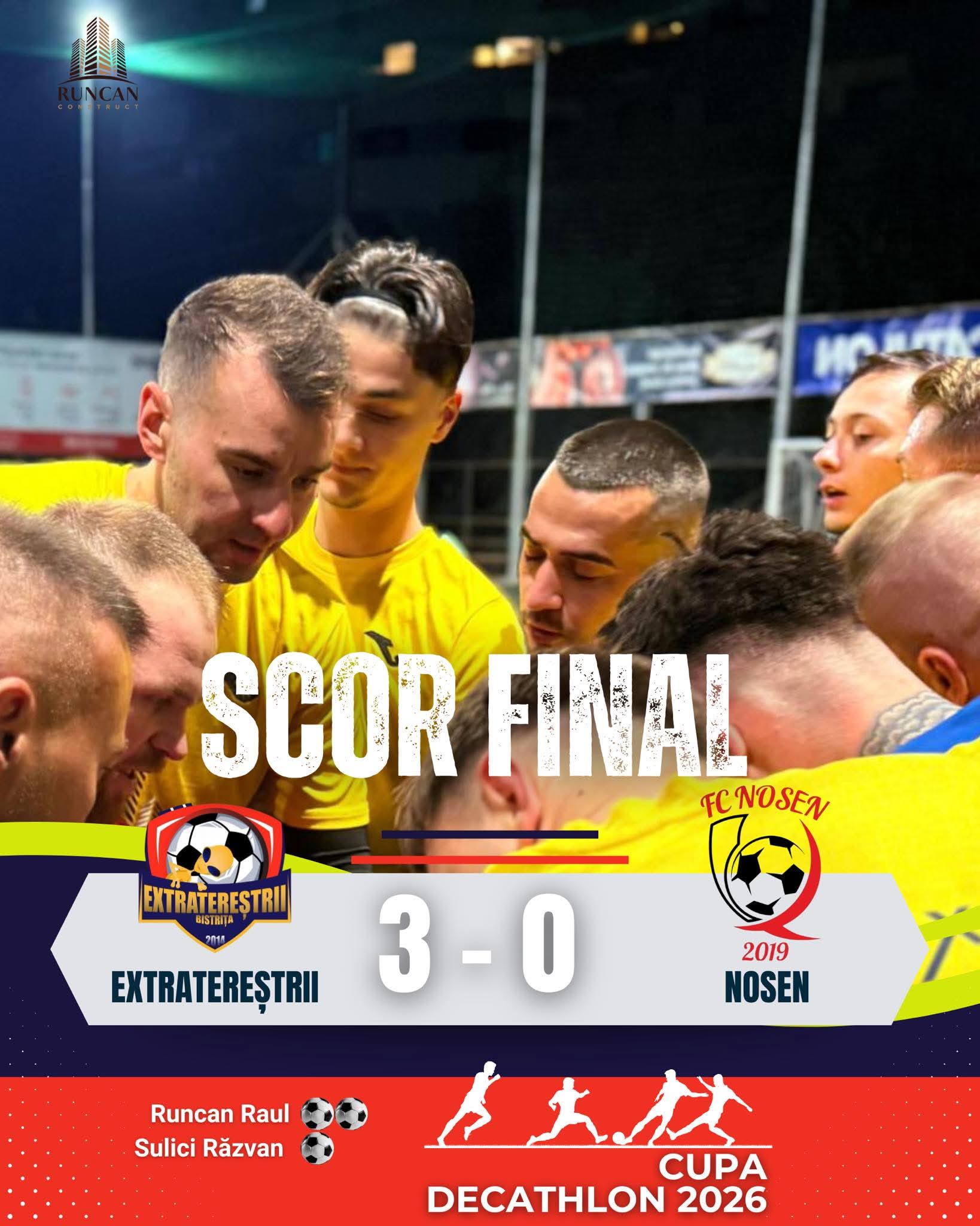 Partida a fost controlată de la un capăt la altul de Extraterestrii, care au intrat pe teren extrem de concentrați și determinați să își continue parcursul în competiție. Jocul colectiv, presiunea constantă și ocaziile bine construite au făcut diferența, scorul final reflectând superioritatea echipei. Rezultatul meciului: Extratereștrii – FC Nosen 3–0
