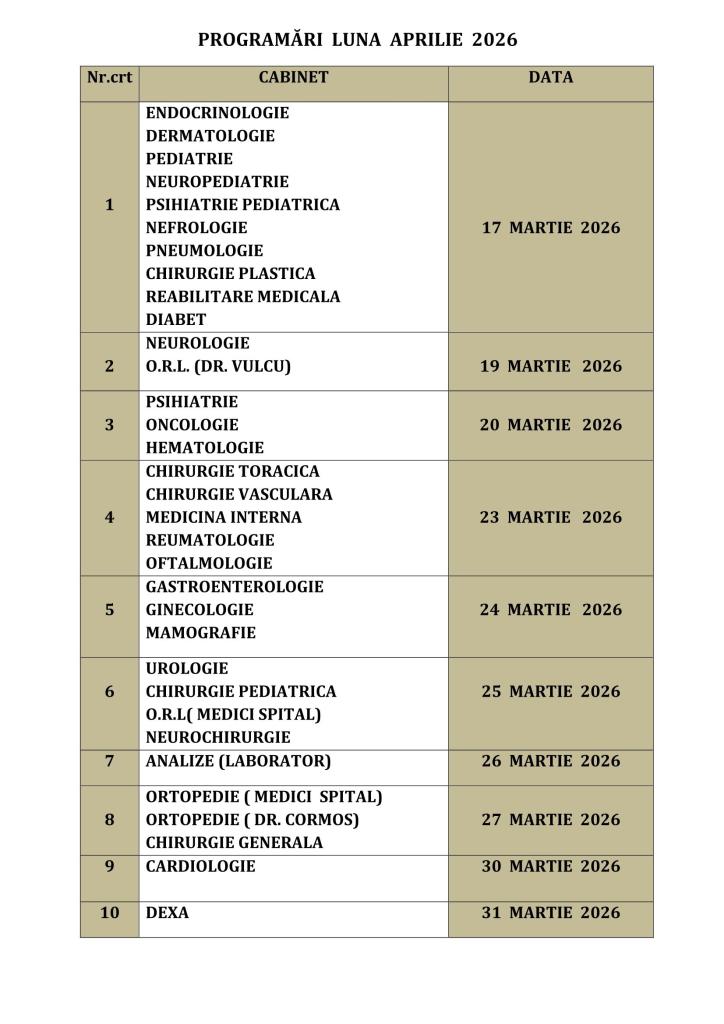 Pacienții care doresc consultații sau investigații în luna aprilie 2026 la Policlinica din cadrul Spitalului Clinic Județean de Urgență Bistrița trebuie să știe că au fost anunțate datele oficiale pentru efectuarea programărilor.