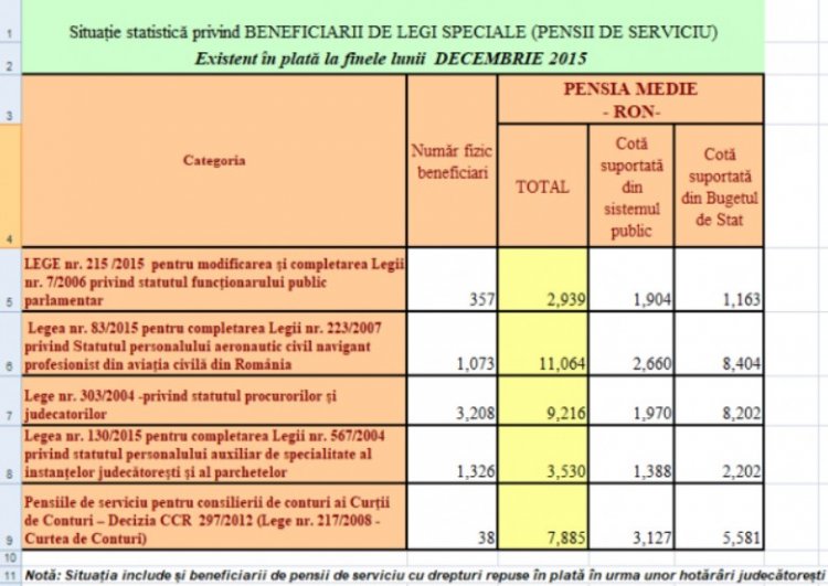 Potrivit datelor citate de Adevărul.ro, în luna decembrie 2015, când CNPP a făcut primele plăţi pentru pensiile foştilor procurori şi judecători, pensia medie era de 9.216 lei, din care 1.970 de lei provenea din contributivitate şi o medie de 8.202 lei era plătită din bugetul de stat, adică din impozitele, taxele şi contribuţiile tuturor românilor, persoane fizice şi juridice.