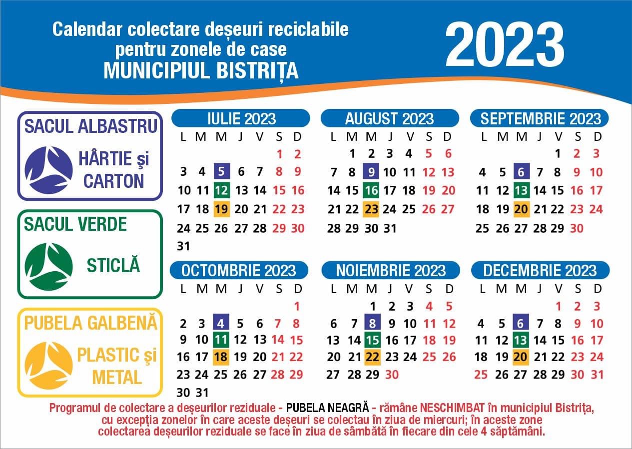 Pentru Municipiul Bistrița și localitățile componente, programul de colectare a deșeurilor reciclabile în luna NOIEMBRIE este următorul: