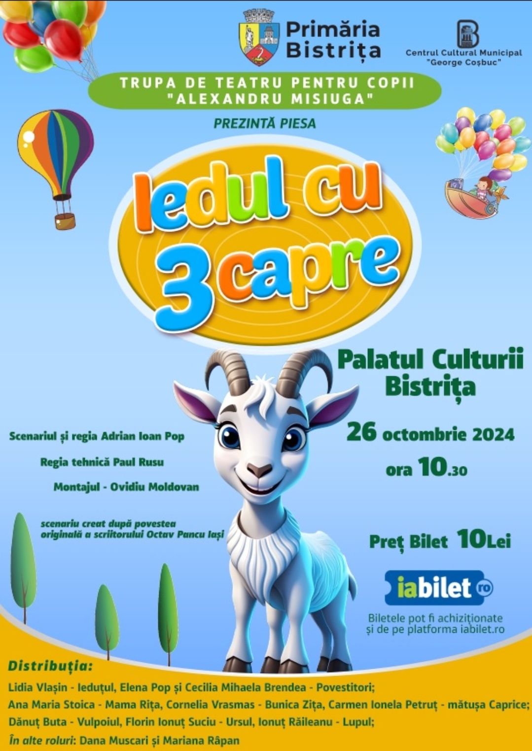 Primăria Municipiului Bistriţa şi Centrul Cultural Municipal „George Coşbuc” alături de trupa de Teatru pentru copii „Alexandru Misiuga” vă invită, sâmbătă, 26 Octombrie 2024, ora 10:30, la Palatul Culturii la spectacolul de teatru: Iedul cu trei Capre