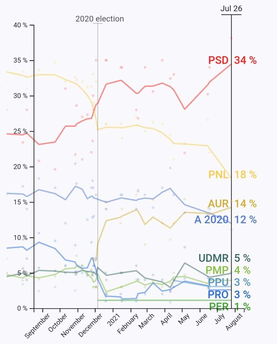 Un sondaj realizat de Politico.eu arată o scădere de 8 % pentru PNL în intenţia de vot, în ultimele 6 luni, de la 26 % la 18%.O scădere se remarcă şi pentru USR PLUS, formaţiunea ajungând de la 15% la 12 %.De cealaltă parte, PSD a înregistrat o creştere de la 31% la 34%, o situaţie similară fiind întâlnită şi la AUR, care a ajuns la 14% în preferinţele de vot ale românilor.