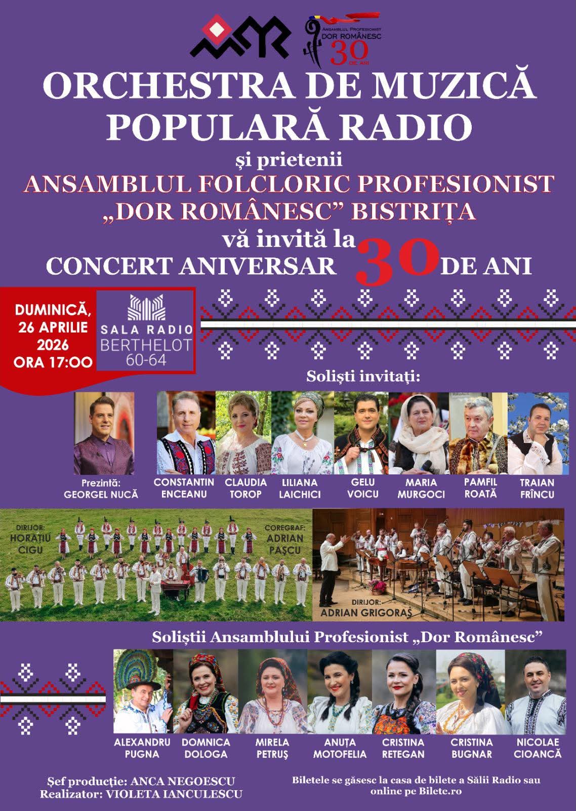 Un eveniment de marcă dedicat folclorului românesc va avea loc duminică, 26 aprilie 2026, de la ora 17:00, la Sala Radio, unde Orchestra de Muzică Populară Radio, alături de Ansamblul Folcloric Profesionist „Dor Românesc”, invită publicul la un concert aniversar dedicat celor 30 de ani de activitate ai ansamblului bistrițean.