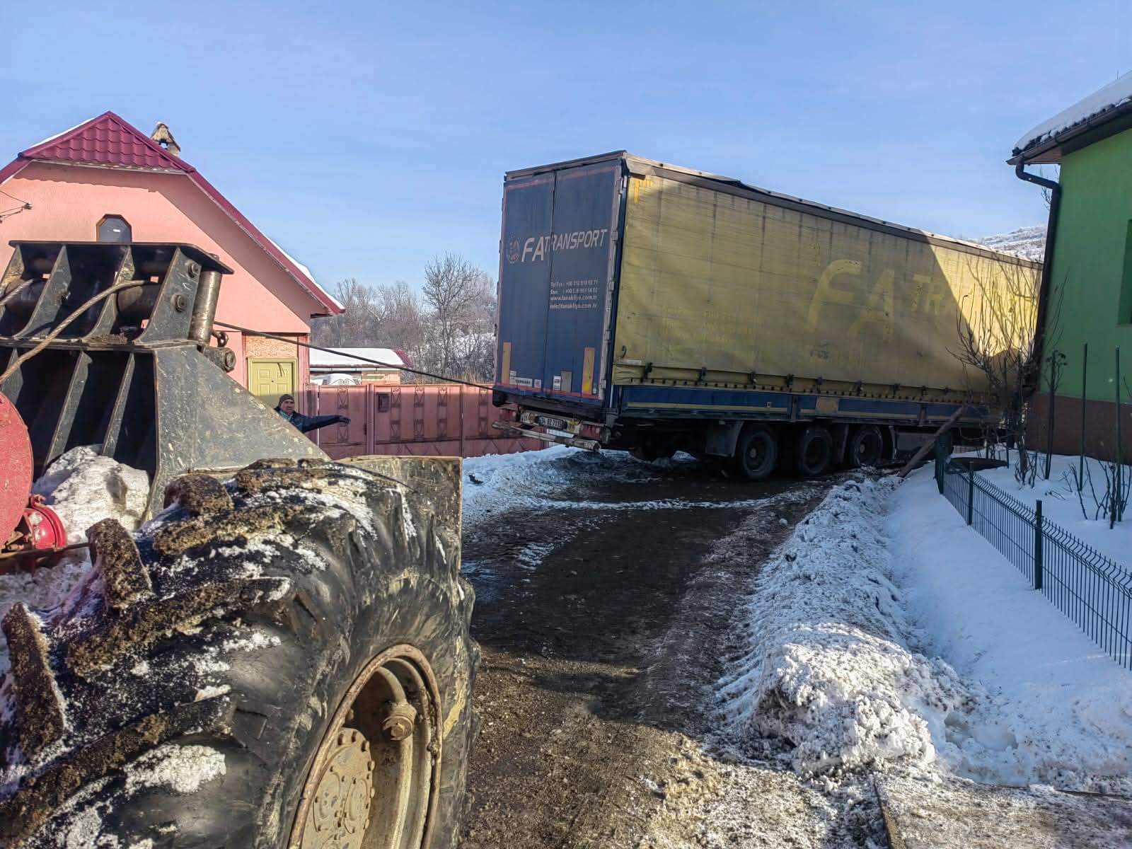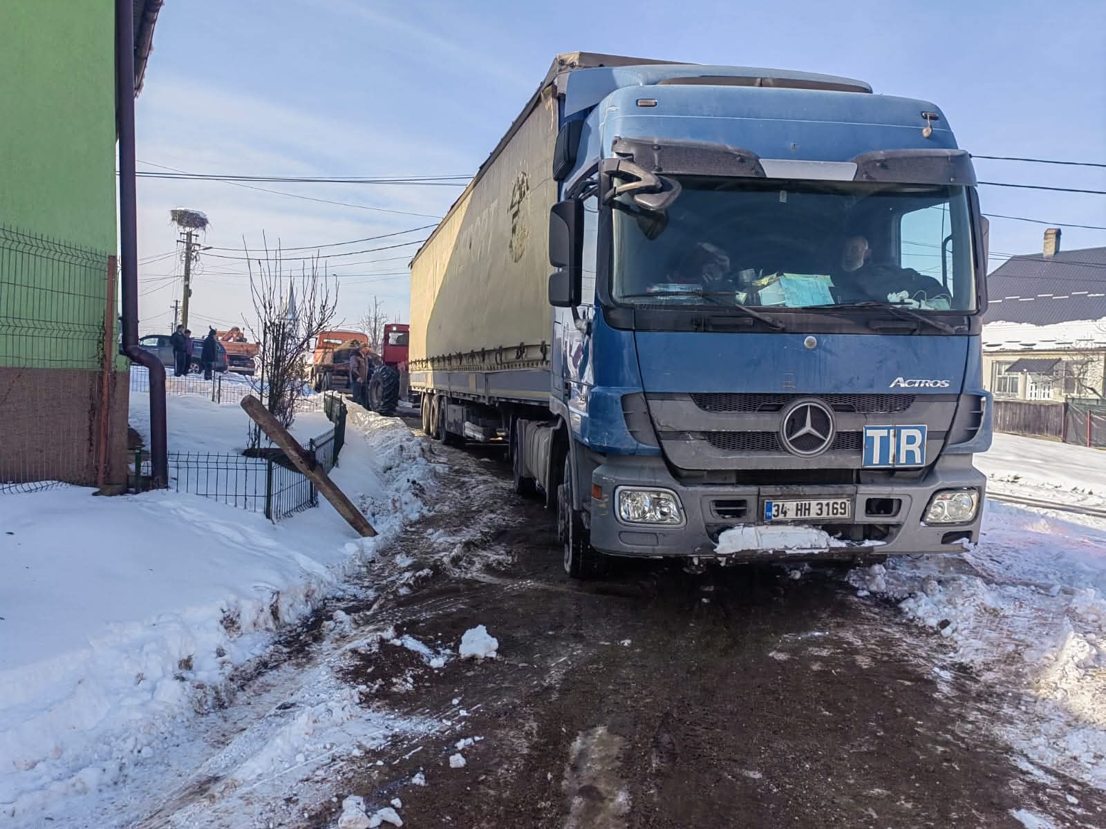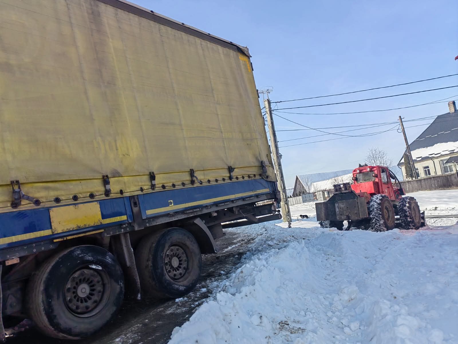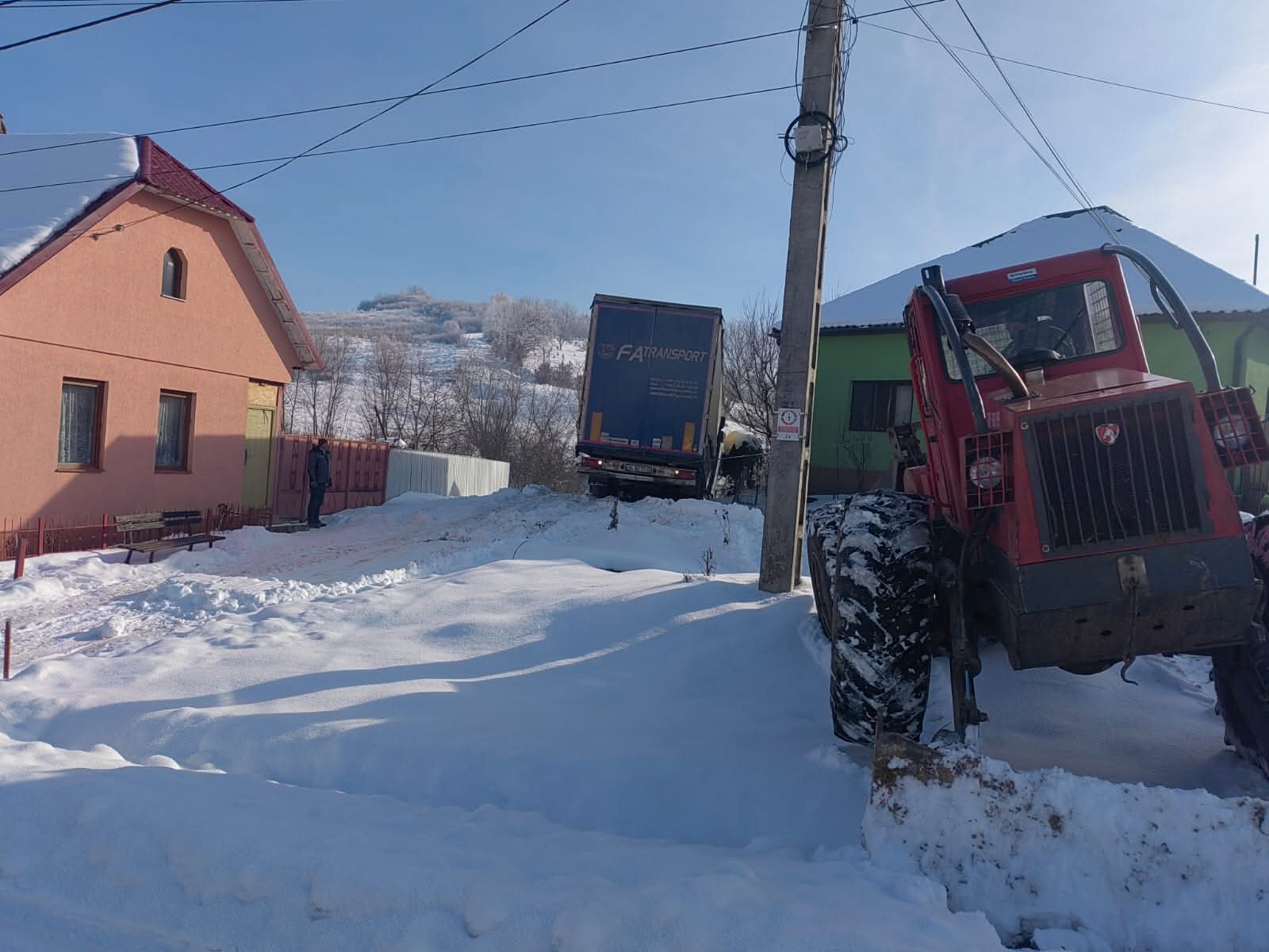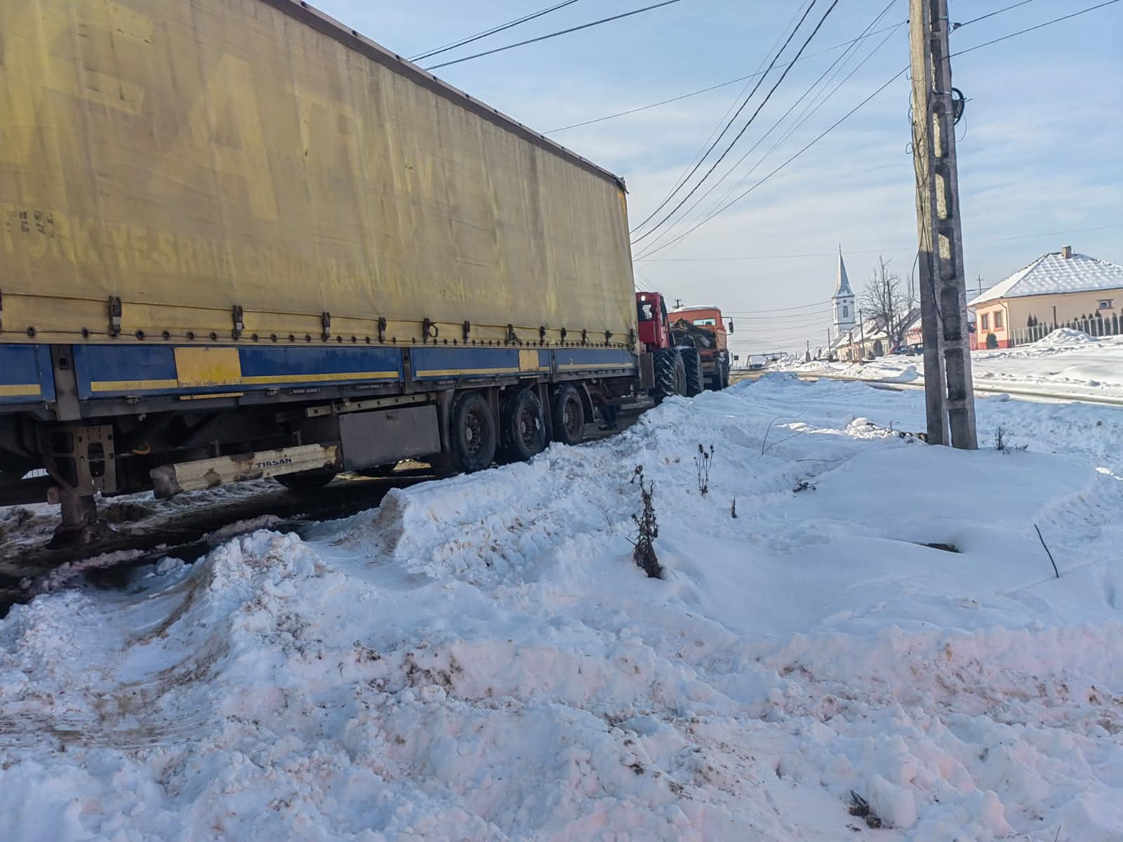 TIR rătăcit pe drum agricol, scos din șanț cu ajutorul comunității. Final fericit în Budacu de Jos