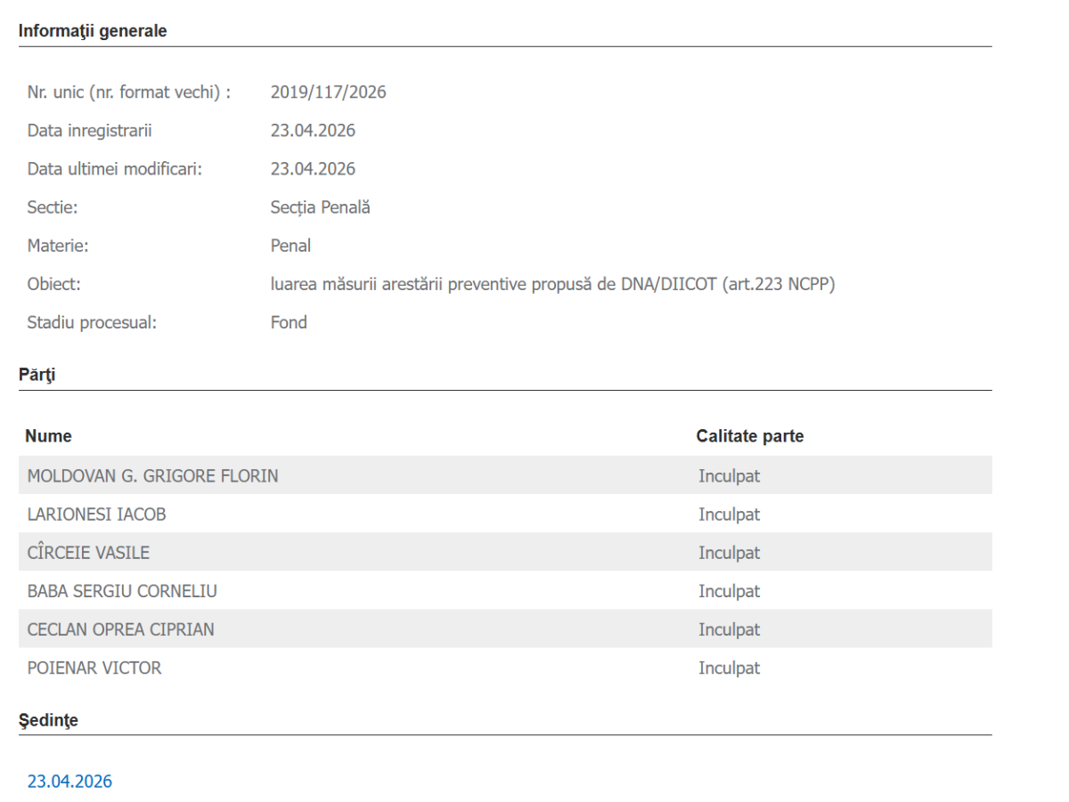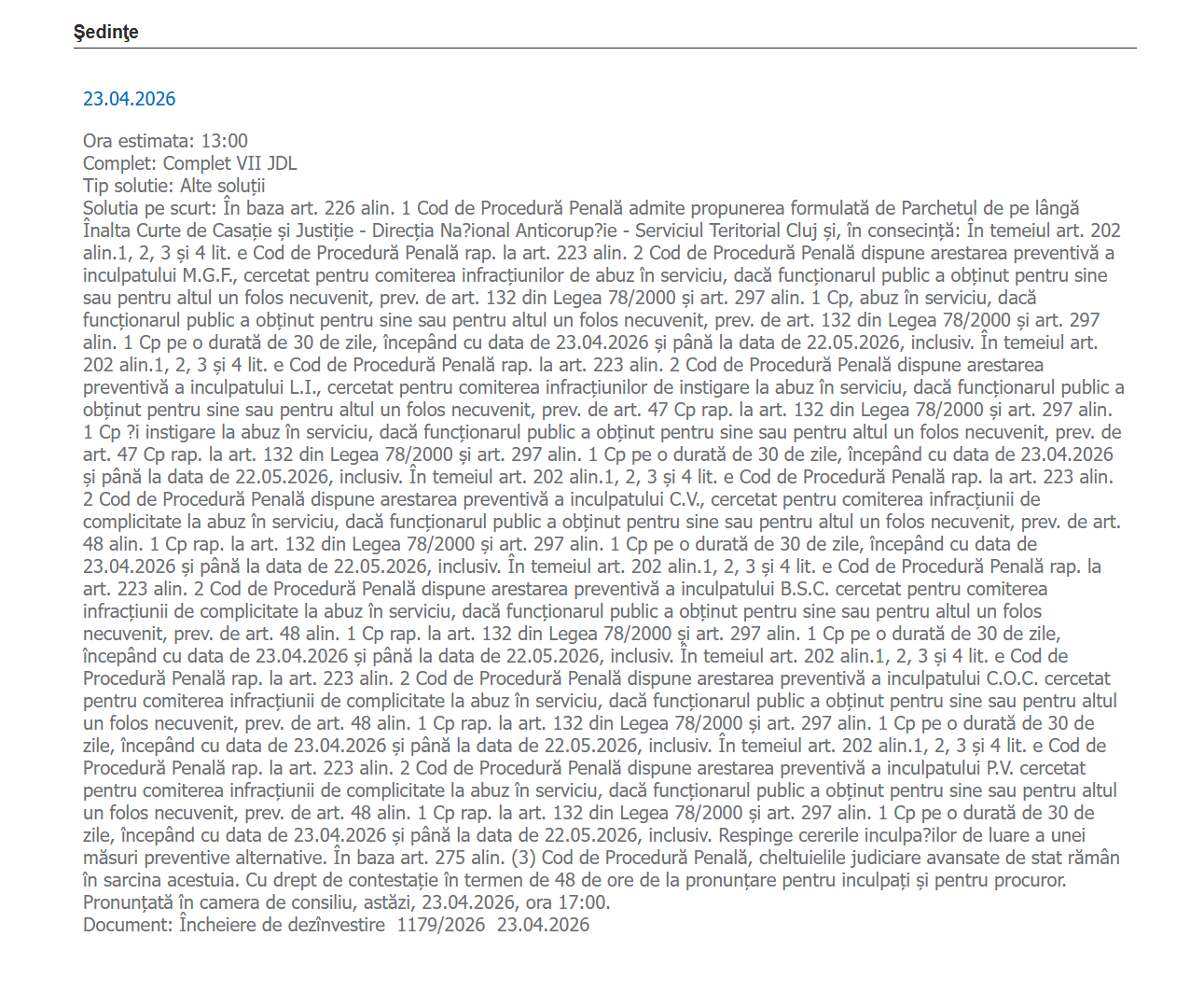 Potrivit informațiilor publicate pe site-ul Tribunalului Cluj, măsura arestării preventive se aplică pentru o perioadă de 30 de zile, respectiv în intervalul 23 aprilie 2026 – 22 mai 2026.