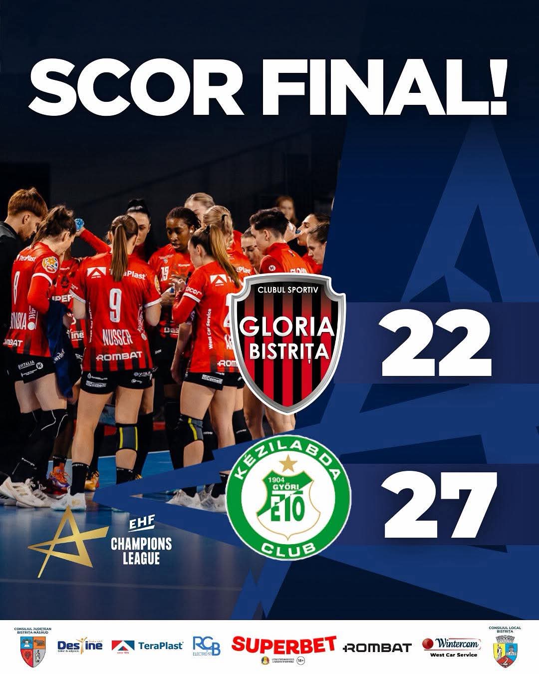 În ciuda unei prime reprize foarte bune și pe care a câștigat-o, Gloria Bistrița a pierdut confruntarea cu Gyor, campioana Europei, scor 22-27 pe parchetul lui Teraplast Arena. Elevele lui Carlos Viver au încasat a 3-a înfrângere în Liga Campionilor și au ajuns la un bilanț de 6-5 în grupa A.