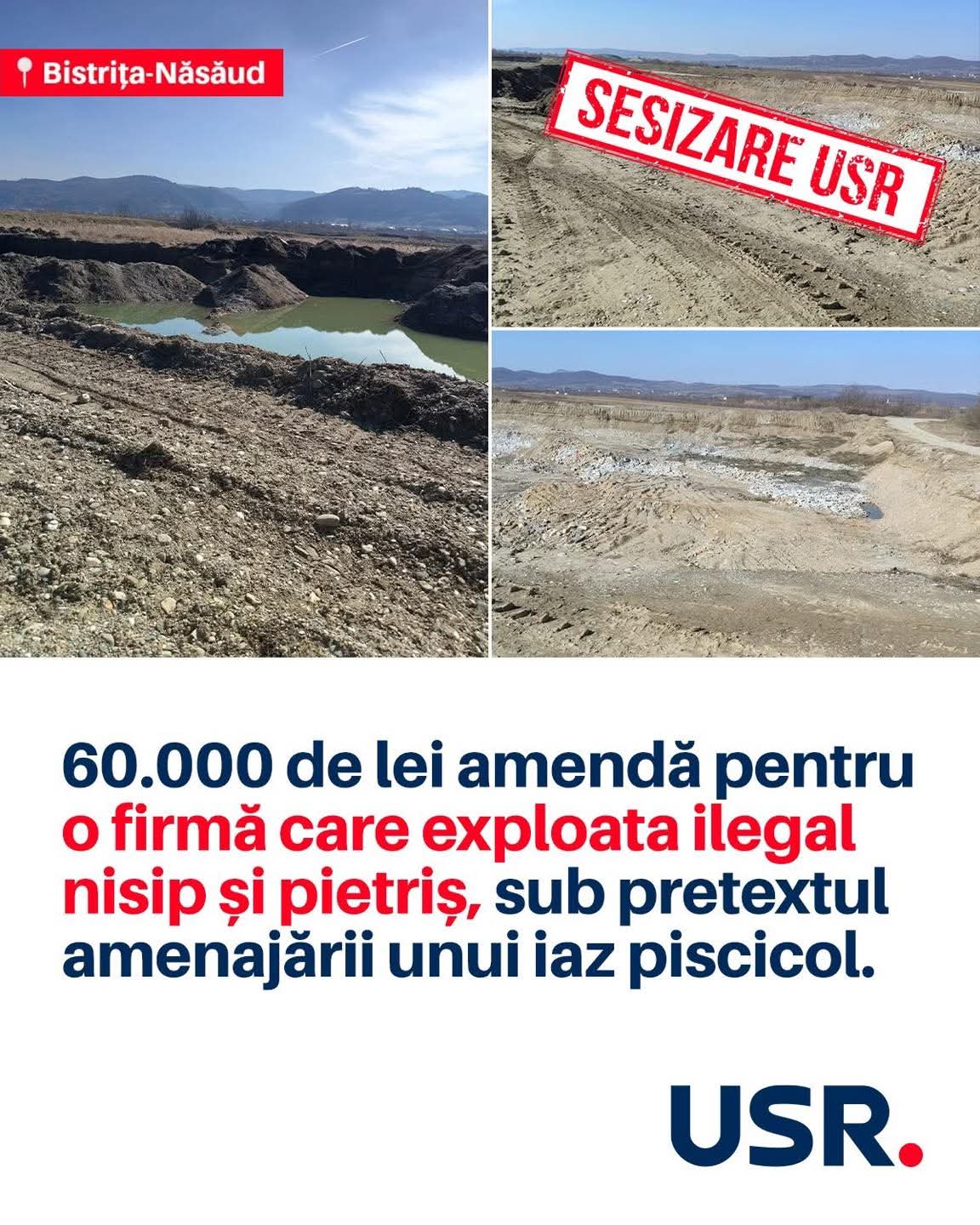 USR: 60.000 de lei amendă pentru o firmă care exploata ilegal nisip și pietriș într-o localitate din județul Bistrița-Năsăud, sub pretextul amenajării unui iaz piscicol
