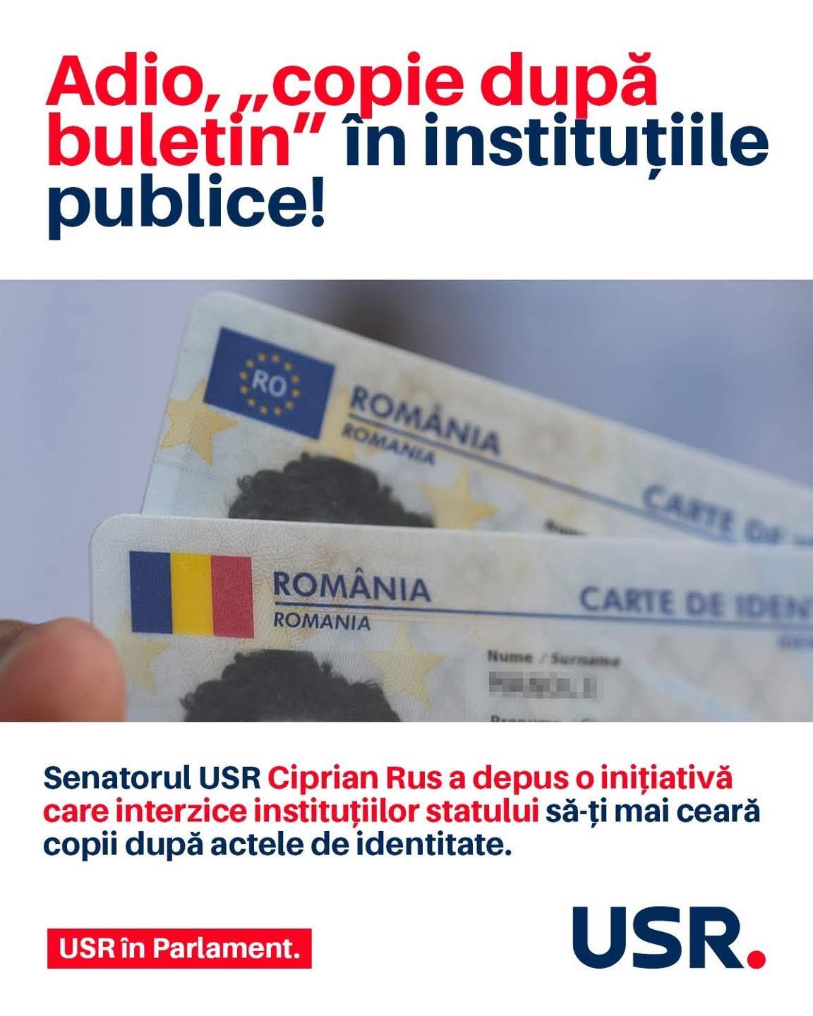 Gata cu „copia după buletin” în instituțiile publice! ✊Senatorul USR Ciprian Rus a depus în Parlament o lege simplă, care te scutește de drumuri și de birocrație inutilă: 𝘀𝘁𝗮𝘁𝘂𝗹 𝗻𝘂 𝗺𝗮𝗶 𝗮𝗿𝗲 𝘃𝗼𝗶𝗲 𝘀ă-ț𝗶 𝗰𝗲𝗮𝗿ă 𝗰𝗼𝗽𝗶𝗶 𝗱𝘂𝗽ă 𝗮𝗰𝘁𝗲𝗹𝗲 𝗱𝗲 𝗶𝗱𝗲𝗻𝘁𝗶𝘁𝗮𝘁𝗲.