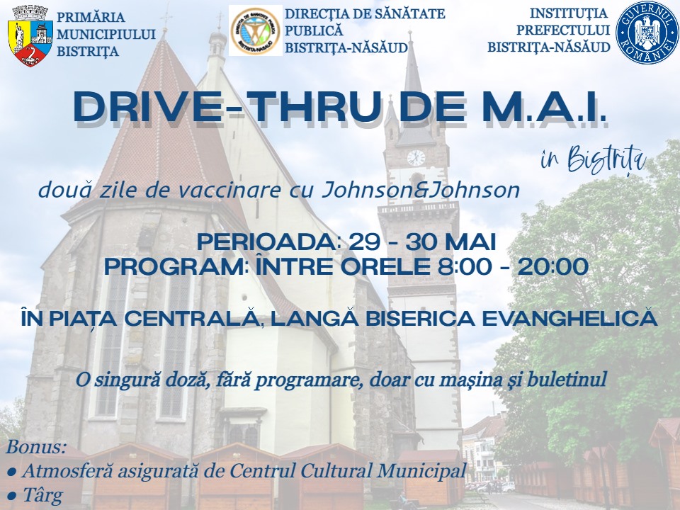 În zilele de sâmbătă și duminică (29 și 30 mai), sunteți așteptați cu mașina în Piața Centrală din Bistrița pentru a vă imuniza cu serul Johnson & Johnson! Echipele de vaccinare coordonate de Serviciul Voluntar pentru Situații de Urgență vă așteaptă între orele 8:00 și 20:00, lângă Biserica Evanghelică, doar cu mașina și buletinul, într-o atmosferă plăcută asigurată de Centrul Cultural Municipal, iar târgul din week-end vă primește cu produse din Bistrița-Năsăud!, transmite instituția.